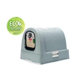 De Curver kattenbak heeft een modieuze uitstraling doordat het een motief heeft van gevlochten rattan. De lade aan de voorkant heeft een plateau met gaatjes, waardoor de kat een groot deel van het kattenbakgrit achterlaat in de bak alvorens de kattenbak te verlaten. Door de uitschuifbare lade kan je in een oogopslag zien of de kattenbak aan verschoning toe is. Aan de bovenkant van de kattenbak bevindt zich een klepje waar de kattenbakschep opgeborgen kan worden.